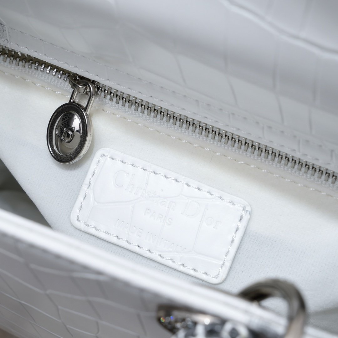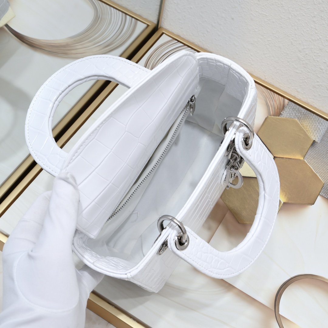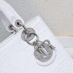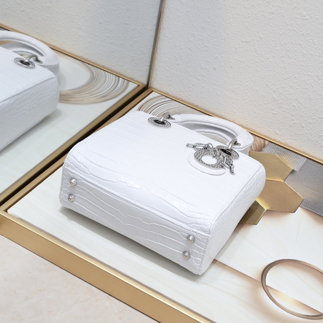 这款Lady Dio.r手袋集中体现了Dio.r对典雅和美丽的深刻洞见。 采用革精心制作, 以藤格纹缉面线打造醒目的绗缝细节, 高雅经典的设计经久不衰。 饰以标志性的同色调珐琅“D.I.O.R.”吊饰, 为精美的轮廓增添一分灵动。 ·尺寸:20* 16.5*8 厘米