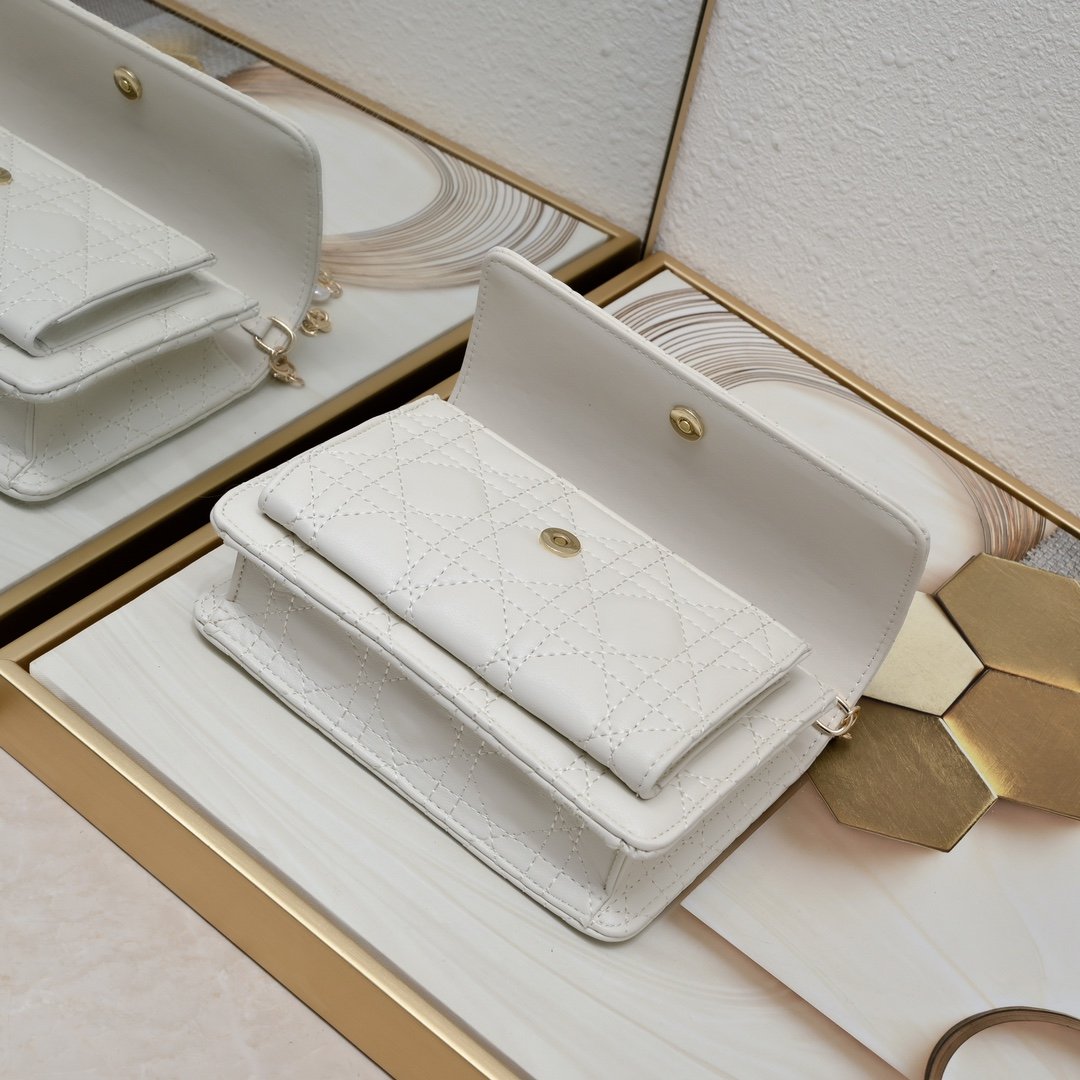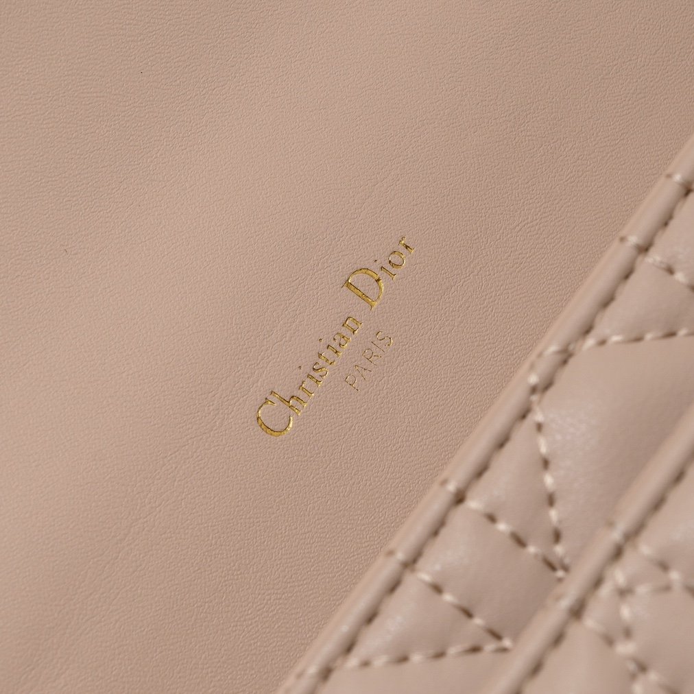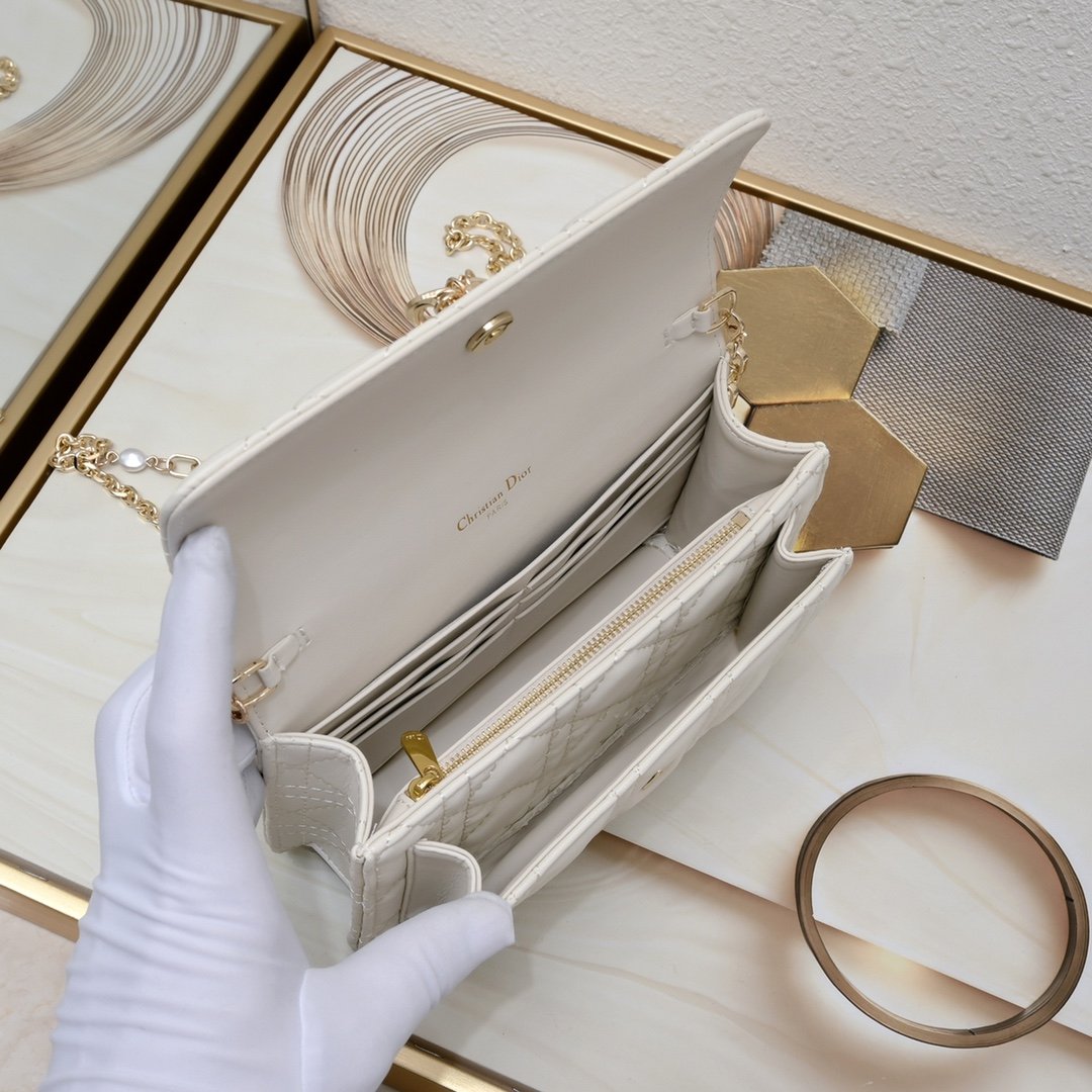 这款 Lady Dior 手拿包设计精巧,空间宽敞。采用羊皮革精心制作,饰以藤格纹缉面线,点缀以“D.I.O.R.”吊饰,彰显时尚经典的魅力。多隔层设计更加实用,可收纳各种日常用品。链条以珠饰装点,便于肩背或斜挎。 正面“D.I.O.R.”吊饰 翻盖开合设计 1 个外侧隔层 1 个内侧隔层 1 个拉链口袋 1 个贴袋 6 个卡槽 链条点缀以珠饰 意大利制造 19.5 x 12.5 x 5 厘编号:0937