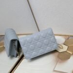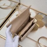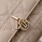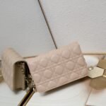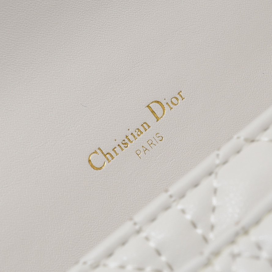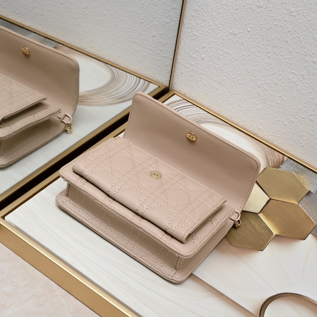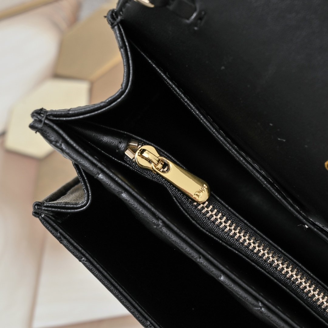 这款 Lady Dior 手拿包设计精巧,空间宽敞。采用羊皮革精心制作,饰以藤格纹缉面线,点缀以“D.I.O.R.”吊饰,彰显时尚经典的魅力。多隔层设计更加实用,可收纳各种日常用品。链条以珠饰装点,便于肩背或斜挎。 正面“D.I.O.R.”吊饰 翻盖开合设计 1 个外侧隔层 1 个内侧隔层 1 个拉链口袋 1 个贴袋 6 个卡槽 链条点缀以珠饰 意大利制造 19.5 x 12.5 x 5 厘编号:0937