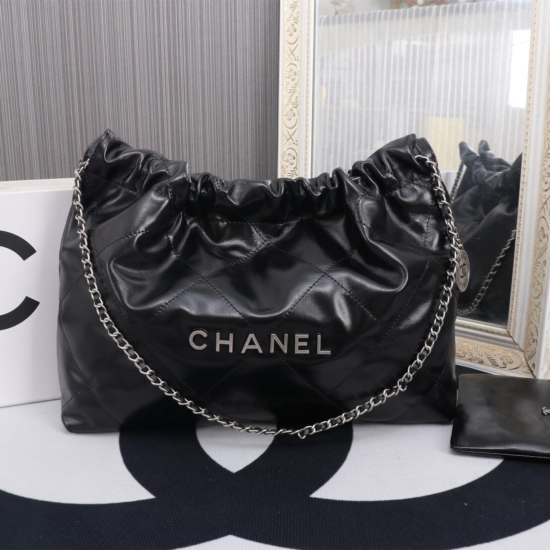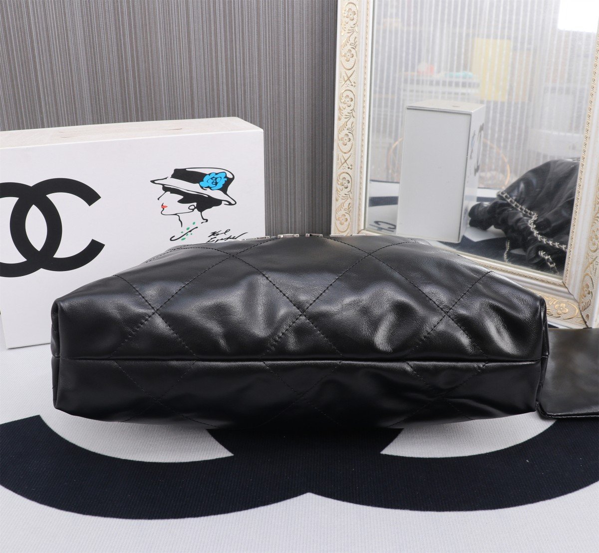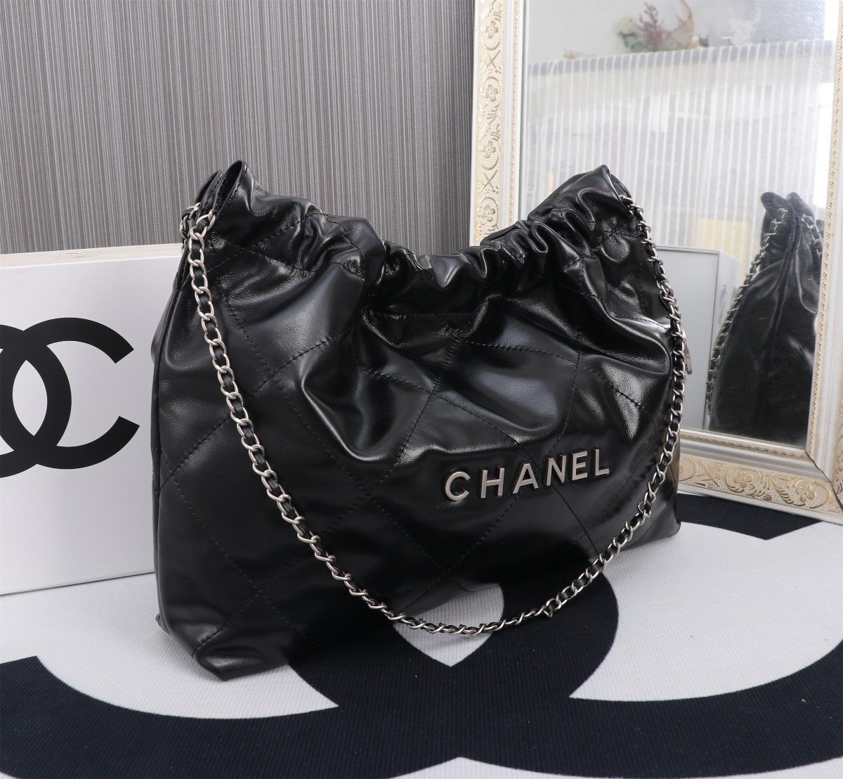Newly launched horizontal 22BAG shopping bag. The horizontal design gives it a more casual and versatile feel. The appearance is simple while focusing on practicality, visibly spacious. Exudes a high-end, cool vibe, suitable for both chic and sweet styles. Hardware: Thick 24K vintage gold plating. Material: Antiba glossy ZP calfskin. Size: 30*45*8 cm. Model number: 8850.