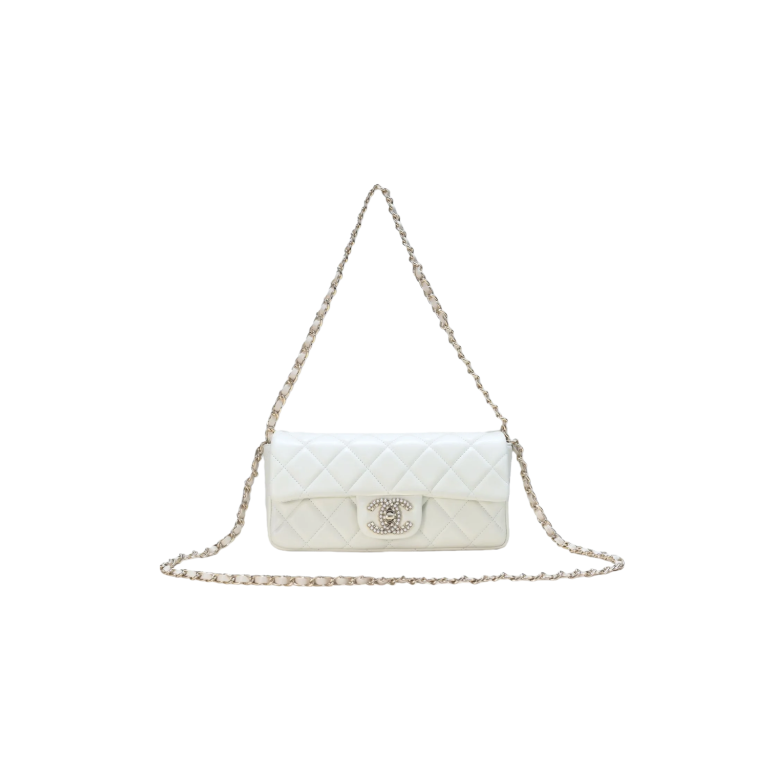Chanel Brand New Baguette Pearl Buckle Bag: Brand new lambskin baguette bag with pearl buckle, baguette pearl evening bag. Available in black and white, exuding nobility, elegance, charm, romance, and minimalism. From the baguette shape to the pearl logo clasp, the overall design is irresistible. French-style elegance, can be worn under the arm, crossbody, or as an evening clutch. Comes with an additional detachable long chain for versatile use. Material: durable lambskin. Size: 25*5*12CM. Style number: 3350.