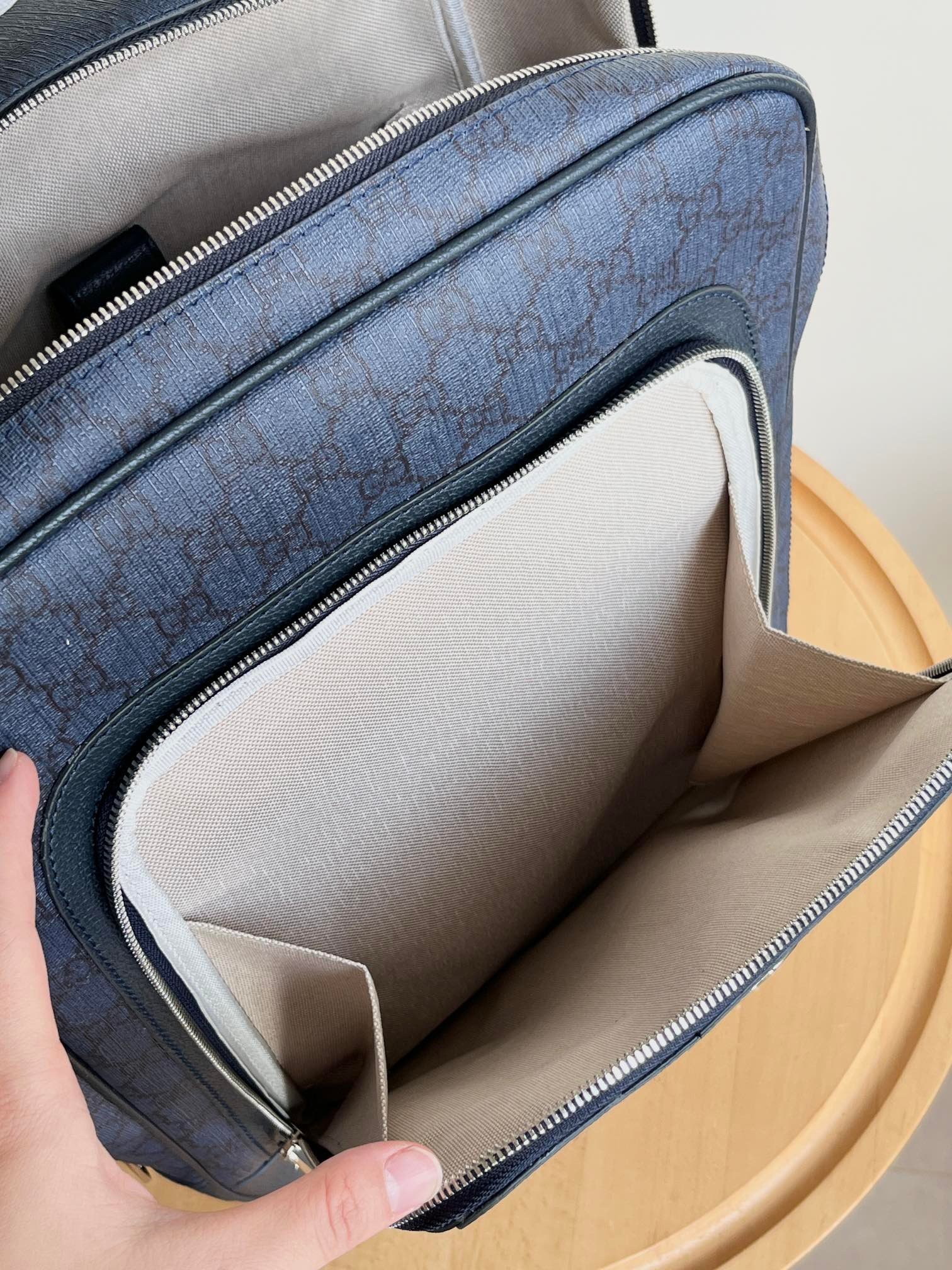 Model: 745718 Size: 30x40x14cm Backpacks have always been an indispensable part of the G house world, available in various shapes and sizes for different preferences. As a member of the ever-expanding Ophidia series, it features textured leather trim. It is adorned with inlaid red and green web stripes, a finely crafted palladium-tone Double G hardware, and a front pocket. Interior: padded laptop compartment and a zip pocket; Exterior: front zip pocket, handle (3 cm high)