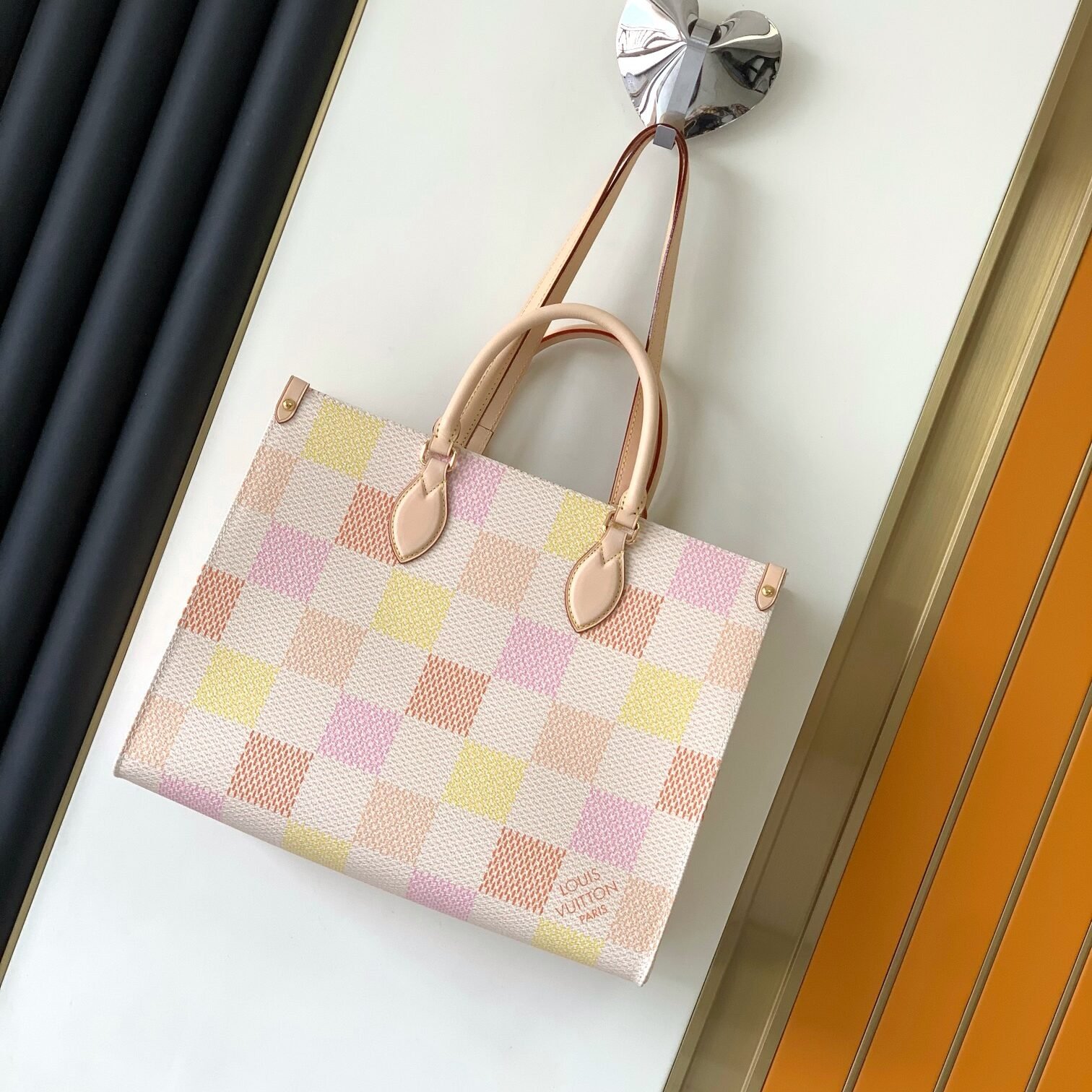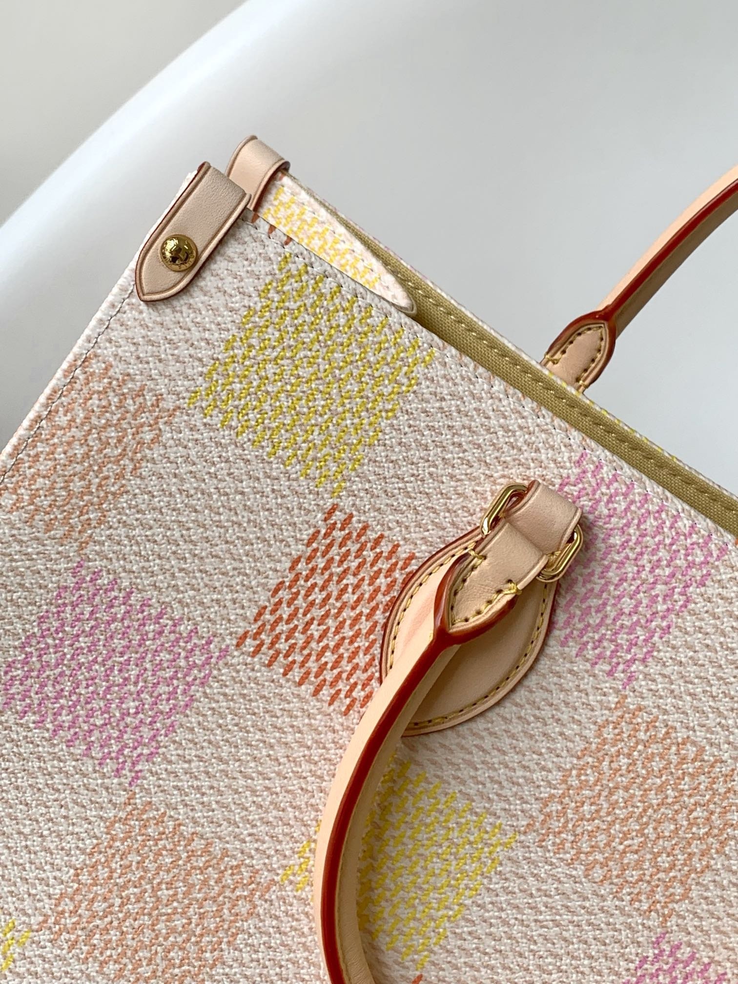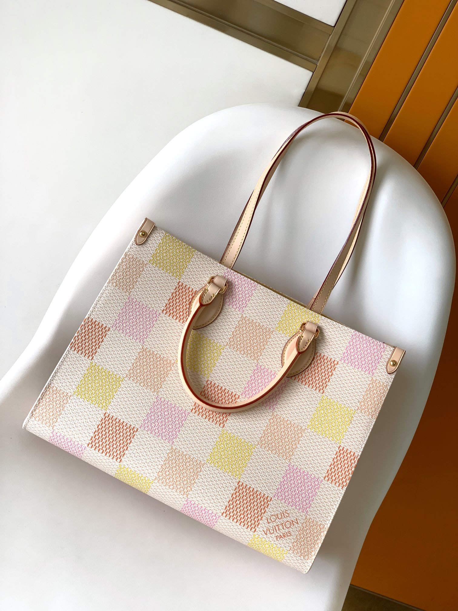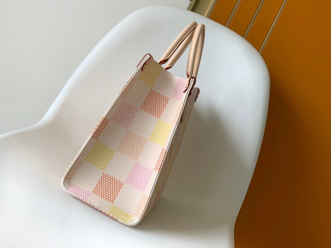 M46913-46912棋盘格 四方包妈咪袋系列 当季新款ONTHEGO 中号手袋 本款 OnTheGo 中号手袋为涂层帆布描绘大号 Monogram Zhr棋盘格图案,再为饰边和内衬铺陈繁复 Monogram ,展现传统葡萄牙花砖的灵感启发。充裕空间结合长短手柄设计,实现日常随行佳选。详细特征35 x 27 x 14 cm(长度 x 高 x 宽)。