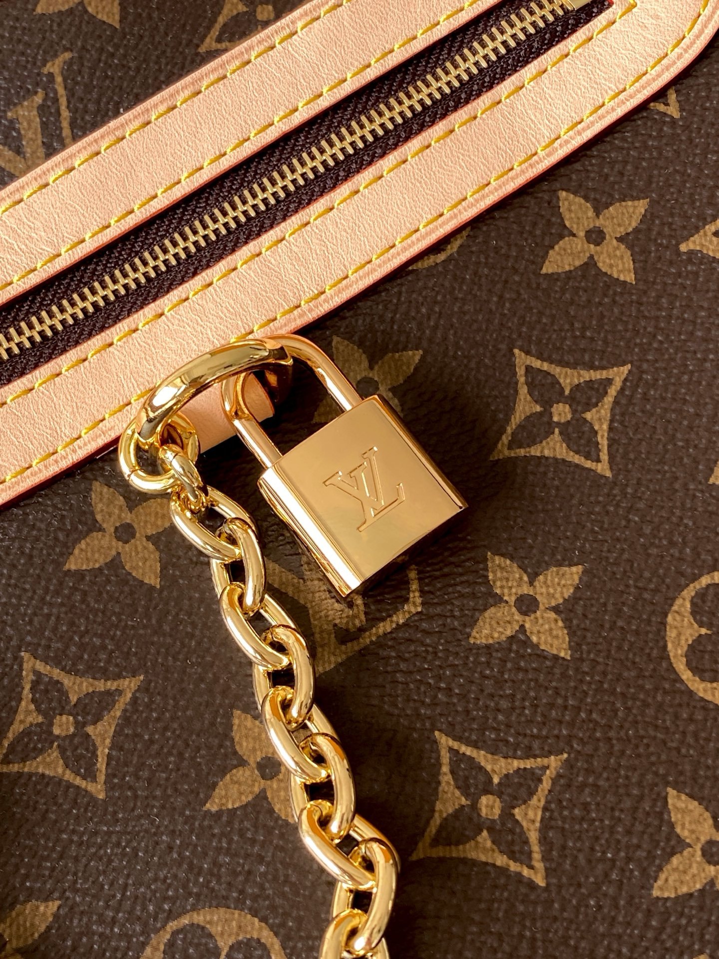 顶级原单 M15208 子母包手提包 Ever More 手袋 这款Ever More 借鉴了巴黎时尚风格,灵感源自Alma手袋的流畅线条。它采用标志性的Monogram帆布制成,并点缀了装饰性的金色链条和牛皮装饰条。此外,它还配备了一条可拆卸的肩带,提供了多种携带方式。这款托特包设计既实用又精致,还包含一个可拆卸的Monogram小袋,可以作为内部隔层使用,也可以单独携带。尺寸 35 x 21 x 12 cm(长度x高度x宽度)