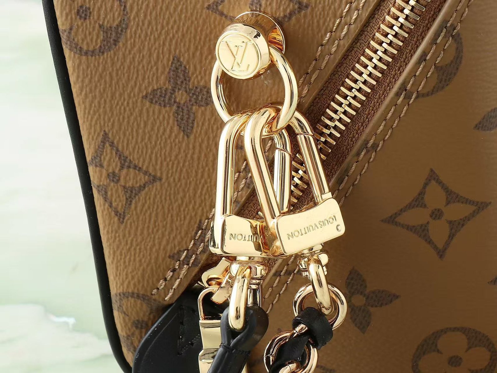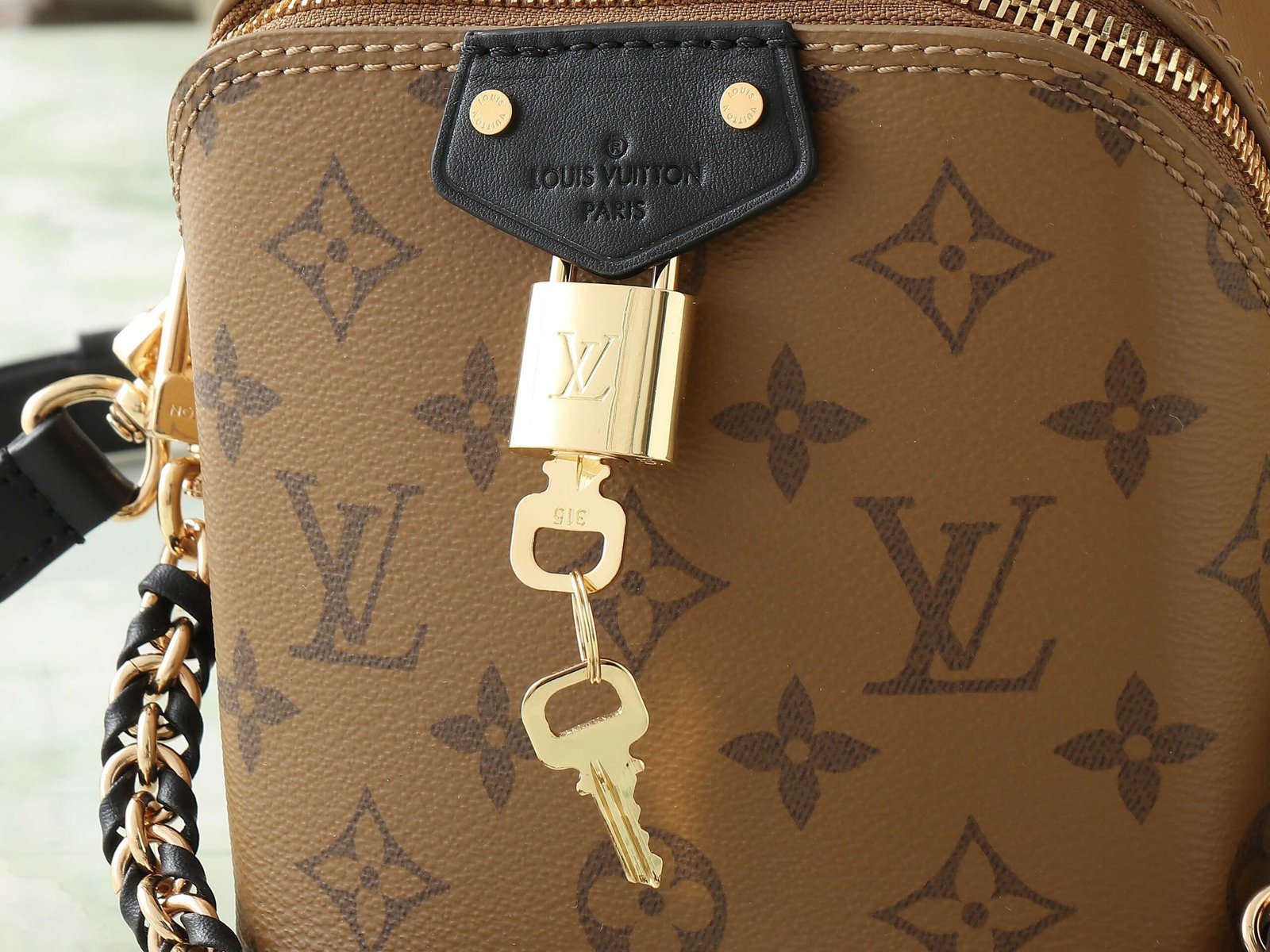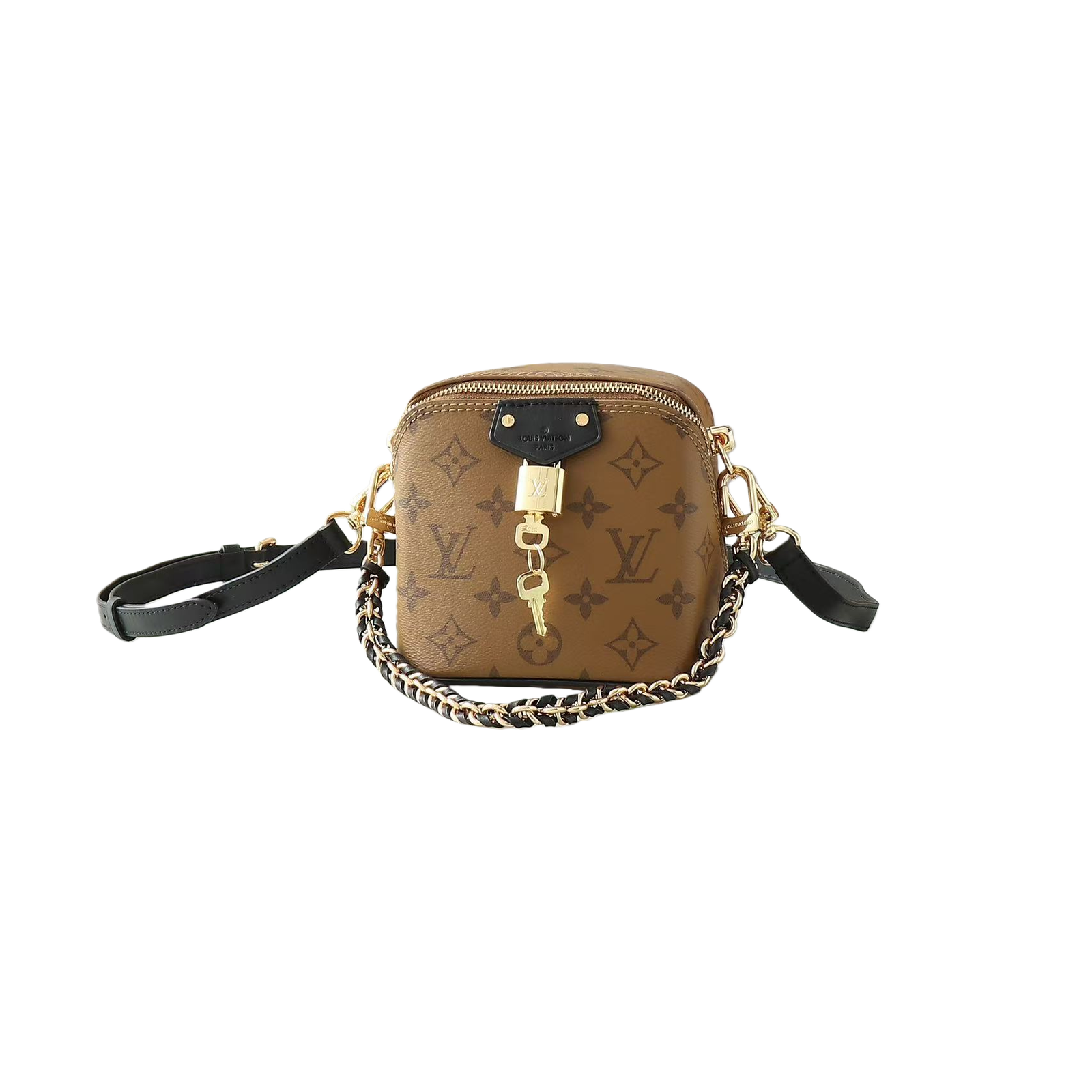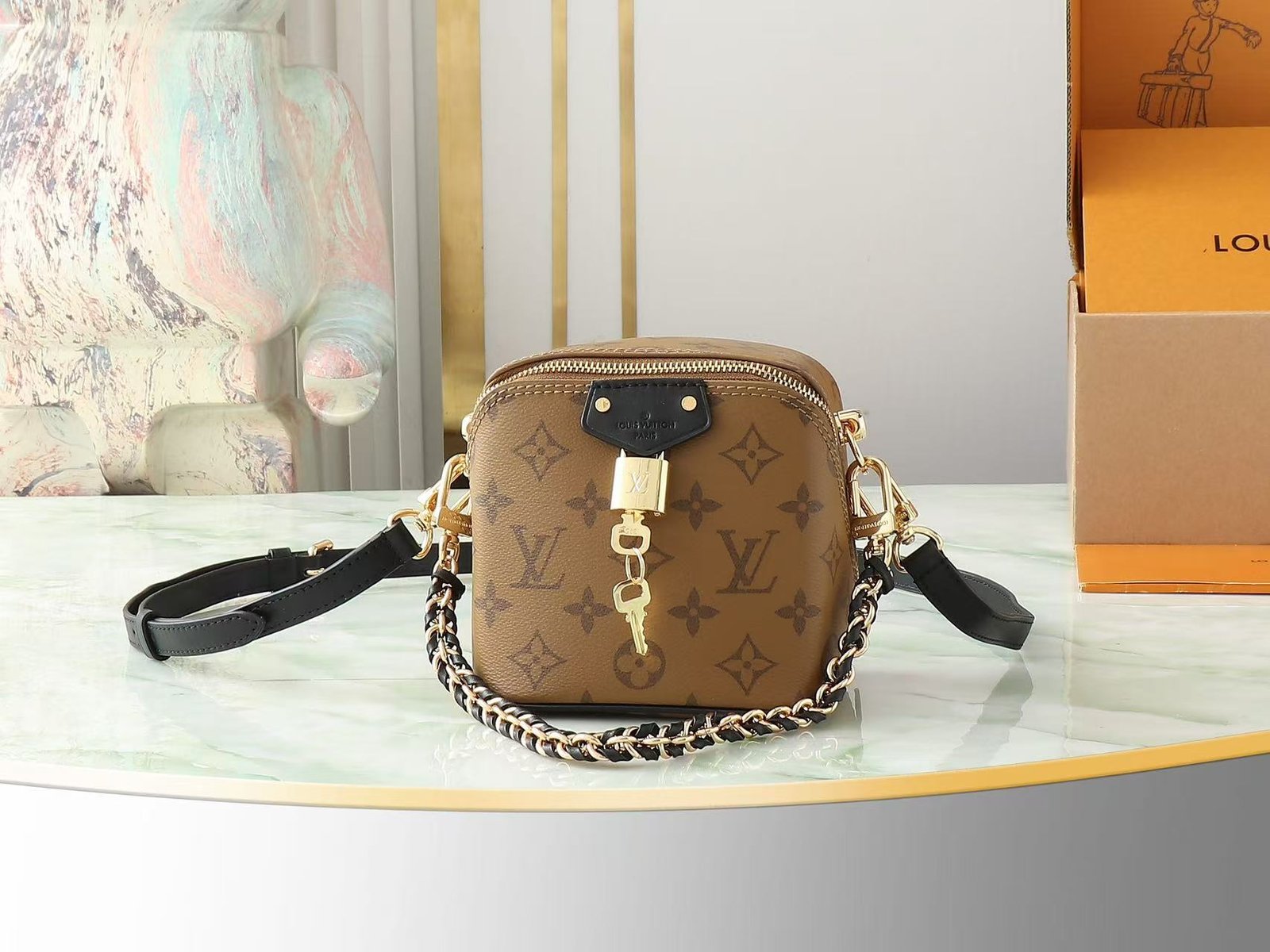 [Top Quality Original, Exclusive Real Photos] M47096 Yellow Monogram Chain Bag Series JUST IN CASE Handbag. The Just In Case handbag traces the brand’s travel heritage, crafted from Monogram Tsd Hl canvas with cowhide leather trim to form a compact shape, suitable for carrying daily essentials such as a phone, keys, and cosmetics. The padlock and key pouch highlight classic details, and both the leather-woven chain and leather shoulder strap are detachable, allowing flexible modern carrying options. Size: 13 x 14 x 11.5 cm.