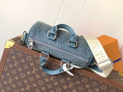 M22762 顶级原单 变码芯片163C 本款 Keepall Bandoulière 25 手袋展现 Monogram Washed Demin 帆布的古着质感,先后以压印和手绘工艺勾勒 Monogram 图案,仿佛一袭经过时间洗礼的褪色丹宁,搭配复古风格名牌和可拆卸并调节的肩带。25.0 x 15.0 x 11.0 cm (长 x 高 x 宽) • Monogram Washed Denim 帆布 • 牛皮革饰边 • 织物内衬 • 金属件 • 拉链开合 • 内贴袋 • 可拆卸名牌 • 肩带:可拆卸,可调节 • 肩带长度:905 cm • 肩带长度最大:63.0 cm • 手柄:双手柄