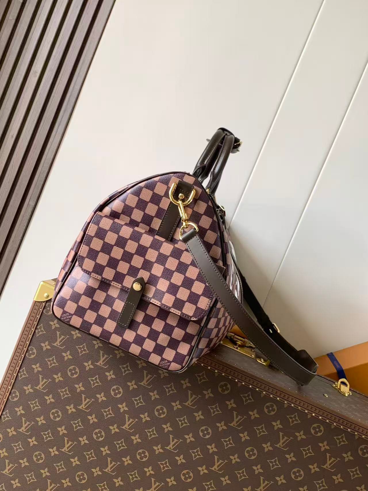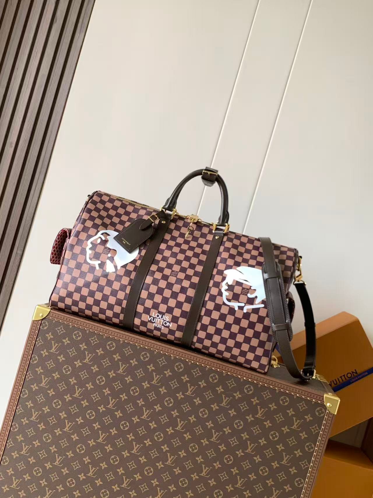 N40799 Coffee Pattern Top-tier Original Order Variable Chip 163C This Keepall Bandoulière 50 travel bag is made of Damier Phriendship canvas, featuring outlines of Pharrell Williams and Japanese artist Nigo over the Damier Ebene pattern, paying tribute to their decades-long close collaboration. Side flap pockets redesign the classic style, with leather trims and striking interior print adding an elegant touch. Dimensions: 29 x 23 x 50 cm (H x W x L). Material: Damier Phriendship coated canvas, leather trim, cotton lining, metal hardware. Features: carry-on luggage size, double zip closure, padlock, side flap pockets, internal zip pocket, detachable name tag. Shoulder strap: removable, adjustable; half length: 36.0 cm, adjustable to: 50.0 cm. Handles: double handles.