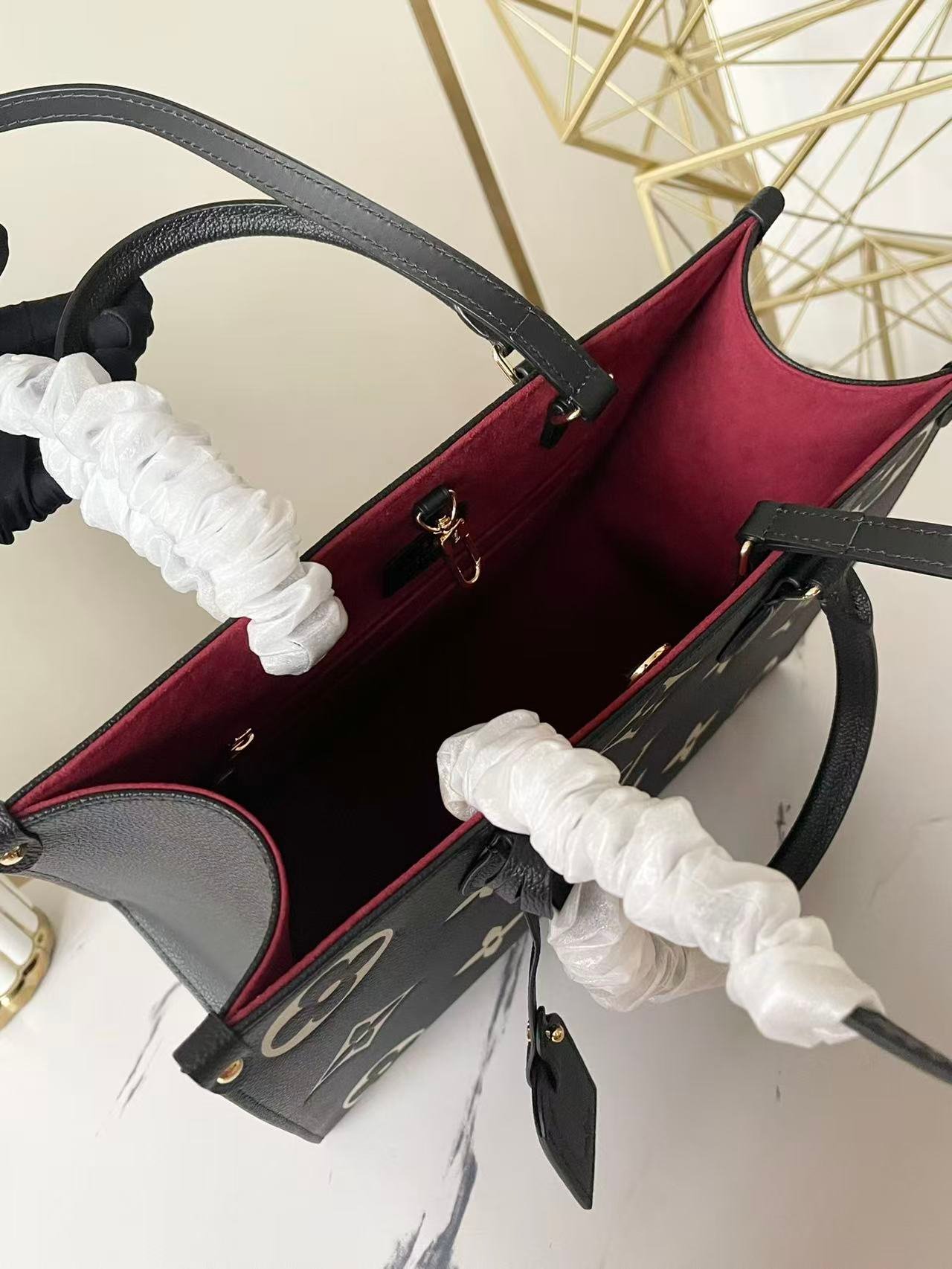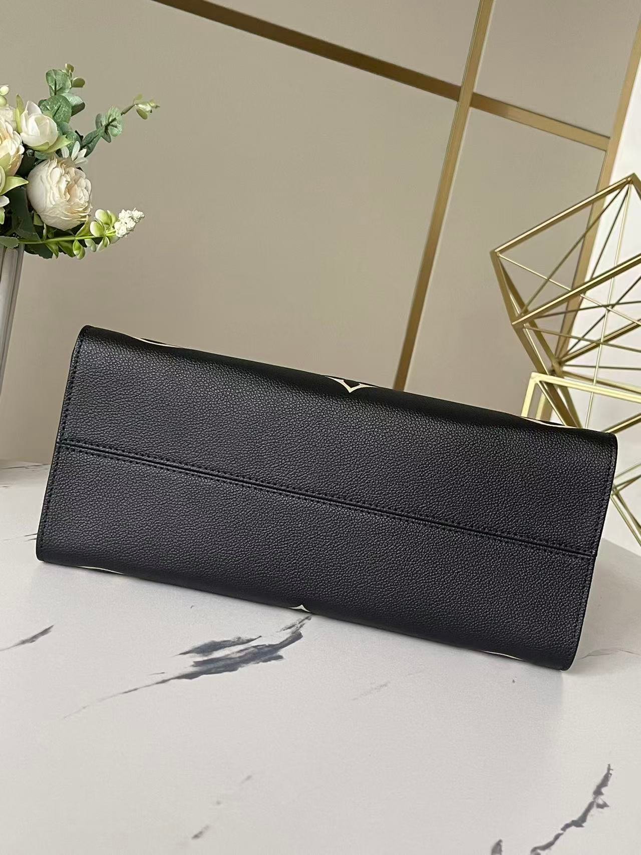 M45495 Black Print This OnTheGo medium tote bag features the Monogram pattern that is first printed and then embossed on soft grained calfskin. Its spacious interior can accommodate a laptop and other office essentials. The long and short handles make it convenient to carry by hand or over the shoulder. Embossed grained calfskin, grained calfskin trim, microfiber lining, metal hardware, interior zip pocket, two inner pockets, dual handles. Detailed dimensions: 34.0 x 26.0 x 13.0 cm.