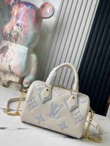 【顶级原单 独家实拍】M46883 M46397 蓝莓牛奶 全皮speedy枕头包系列 本款 Speedy Bandoulière 20 手袋出自崭新 Dégradé 系列,Monogram Empreinte 压纹皮革包身呈现缤纷色彩,为当季着装增添一抹亮色。辊压 Toron 手柄与可调节肩带实现肘挎肩背随心切换,成就都市生活与夏日聚会良伴。20.5 x 13.5 x 12.0 厘米 (长 x 高 x 宽)